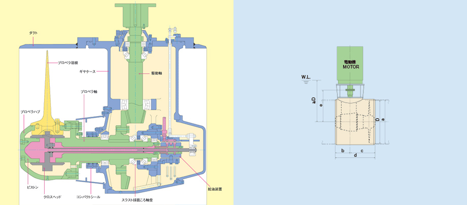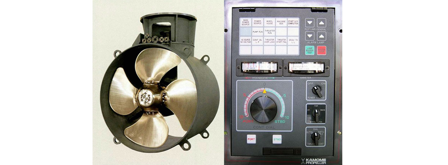 TCB-type series side thrusters incorporate controllable pitch propellers. An engine, electric motor or hydraulic motor may be used with them as a drive mechanism. They require no propeller reverse mechanism and therefore allow quick conversion in thrust direction and easy adjustment for thrust level. An easily operable and compact control system, KTC100 enables ship control beginning with start-up on a single control panel. A ship can be optimally controlled by operating a single dial.